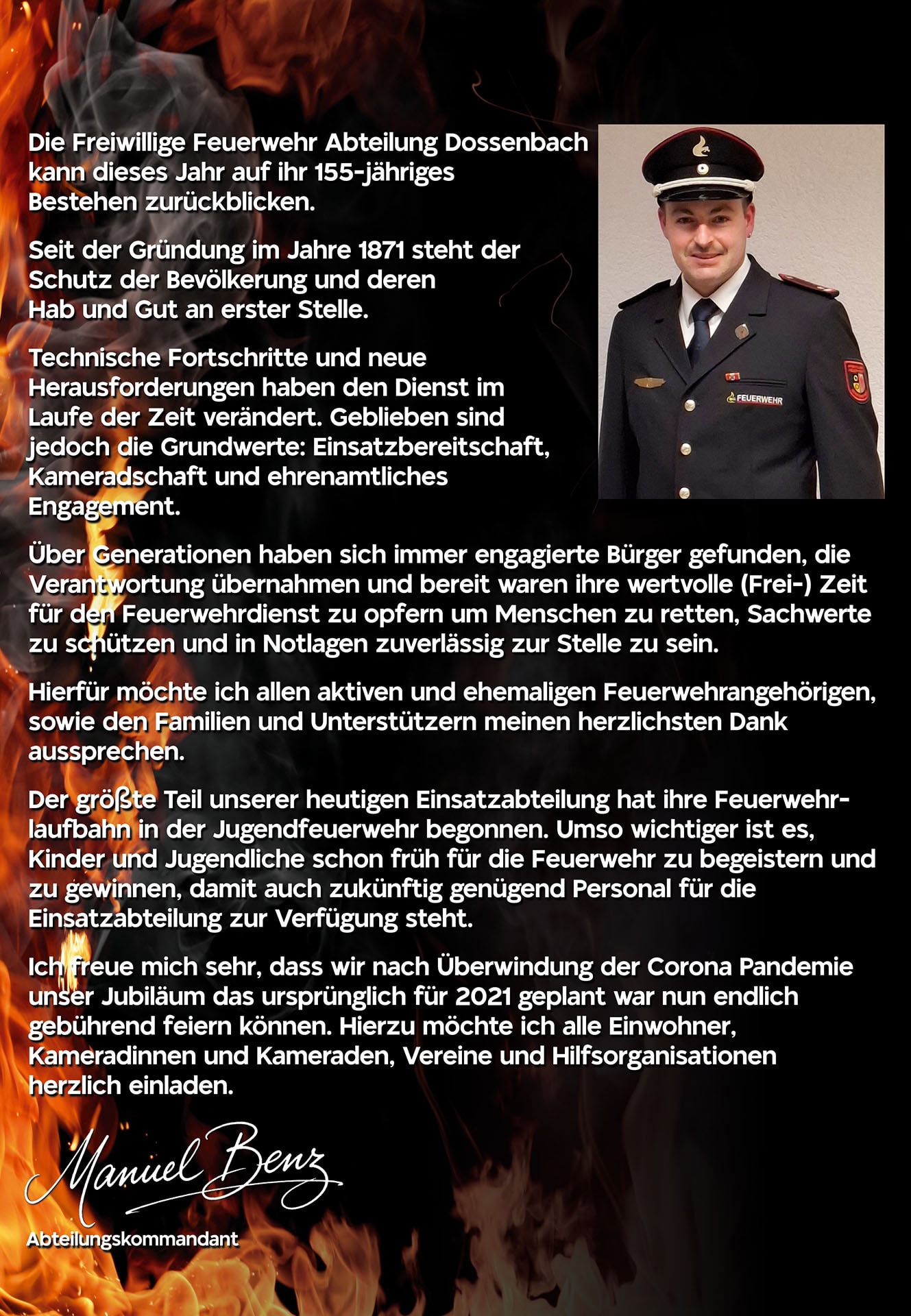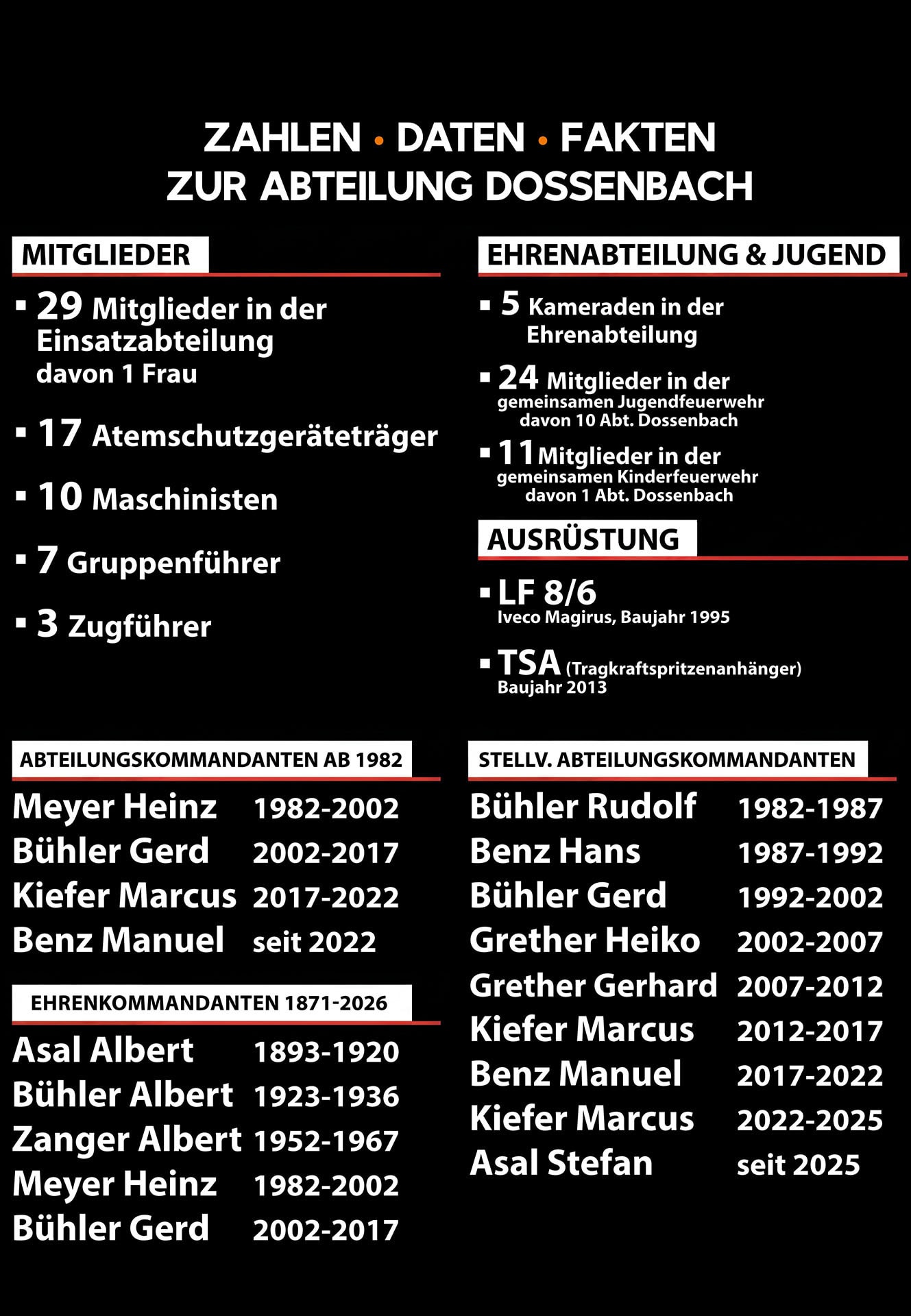 Die Freiwillige Feuerwehr Abteilung Dossenbach kann dieses Jahr auf ihr 155-jähriges Bestehen zurückblicken.